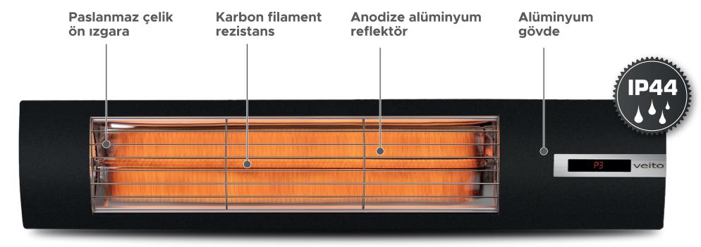 Veito Space S Black оснащён карбоновым нагревательным элементом, который обеспечивает быстрый и равномерный прогрев без пересушивания воздуха. Прибор работает в нескольких режимах мощности до 2500 Вт, что позволяет гибко настраивать интенсивность обогрева в зависимости от площади помещения и погодных условий.